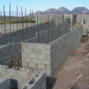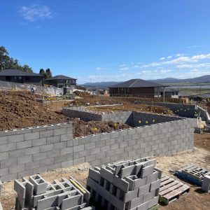 240mm wide Concrete Blocks- Generally designers detail 240mm blocks for levelling up foundations, constructing the ground floor walls of two-storey dwellings as well as using them for lift shafts and retaining walls to achieve greater wall heights. The 240mm block width allows for 100mm of load bearing or stud width, a 50mm wide cavity to comply with the B.C.A.